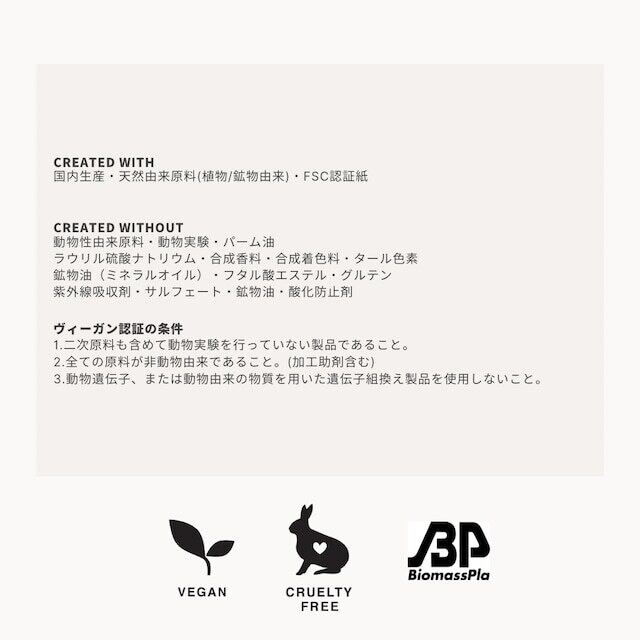 イソドデカン、トリメチルシロキシケイ酸、パルミチン酸デキストリン、マイクロクリスタリンワックス、カルナウバロウ、水添ポリデセン、ポリソルベート85、(VP/エイコセン)コポリマー、ジステアルジモニウムヘクトライト、炭酸プロピレン、ヤシ脂肪酸ソルビタン、水添(スチレン/イソプレン)コポリマー、水、ナイロン-6、フェノキシエタノール、シリカ、BG、ケブカワタ種子油、パンテノール、エタノール、ダイズタンパク、マンダリンオレンジ果皮エキス、センブリエキス、ウコン根茎エキス、アカツメクサ花エキス、イチジク果実エキス、酸化鉄、カーボンブラック
